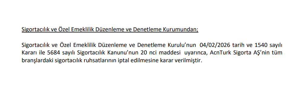 Sigortacılık ve Özel Emeklilik Düzenleme ve Denetleme Kurulu’nun 04/02/2026 tarih ve 1540 sayılı Kararı ile 5684 sayılı Sigortacılık Kanunu’nun 20 nci maddesi uyarınca, AcnTurk Sigorta AŞ’nin tüm branşlardaki sigortacılık ruhsatlarının iptal edilmesine karar verilmiştir.